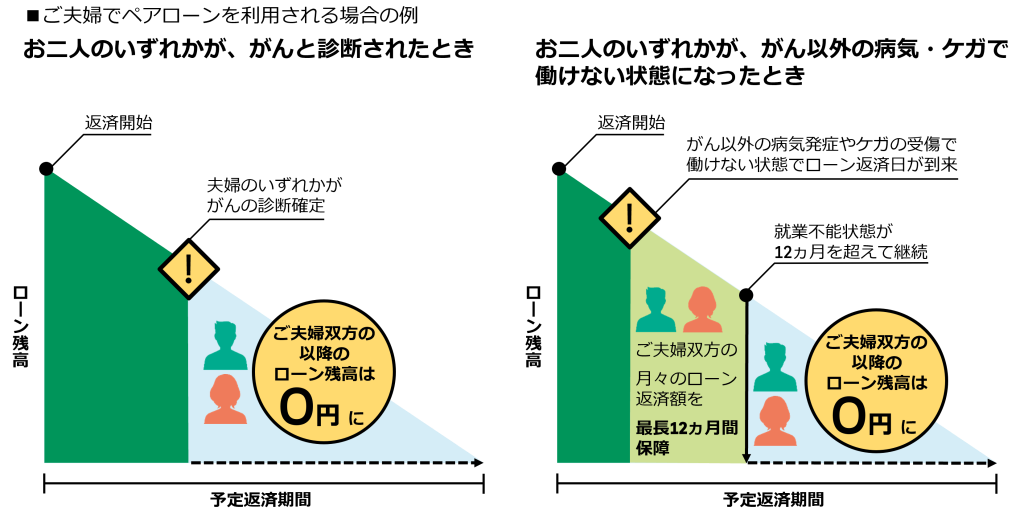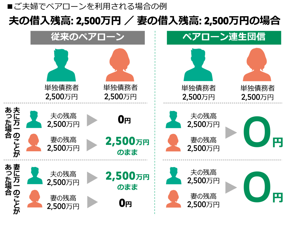 連生団信は、従前より連帯債務で住宅ローンをお借入れになるご夫婦等を対象に提供してまいりましたが、今般、ペアローンをご利用になる方々にも、大きな安心をお届けできるようになりました。